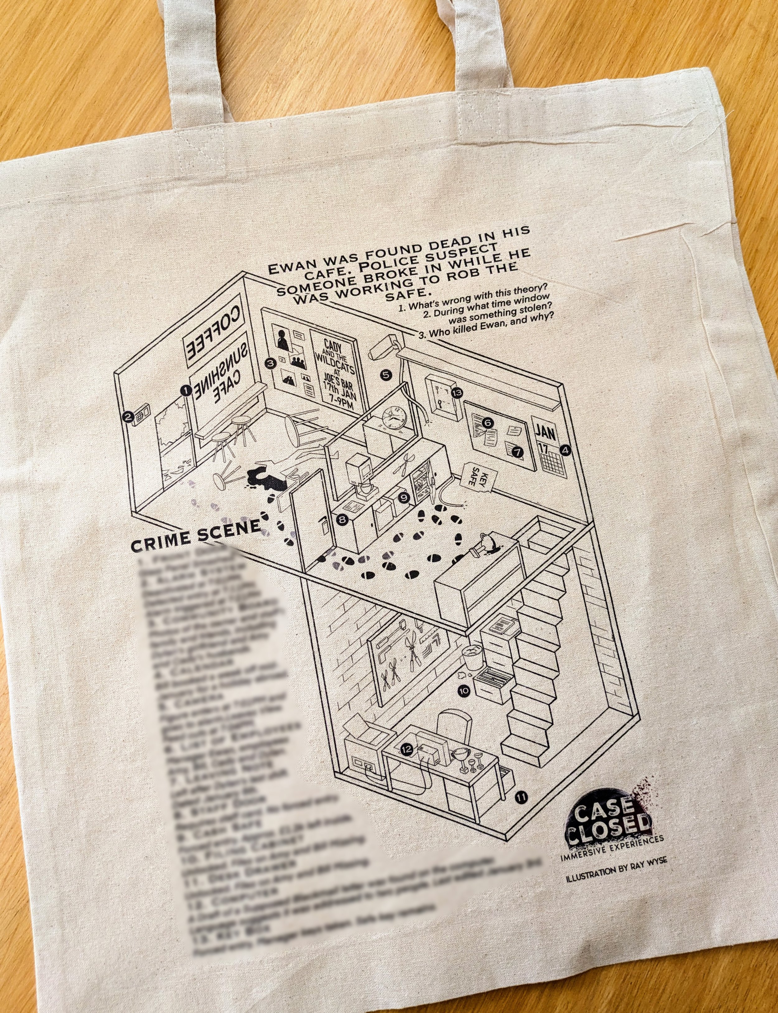 More than just merch. Our tote bags and posters are fully solvable murder mystery games. Check them out!